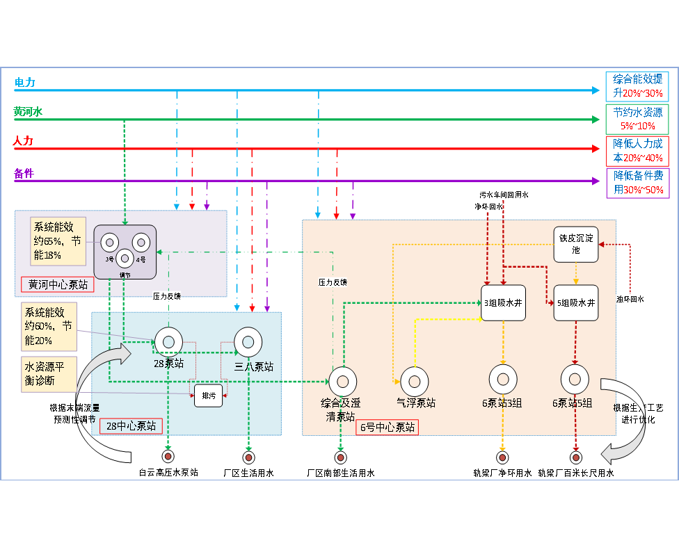 根據(jù)工藝用水規(guī)律和用水指標(biāo),實(shí)時(shí)調(diào)整水系統(tǒng)的供水及水的轉(zhuǎn)換,既節(jié)約能耗又提升工藝品質(zhì)。